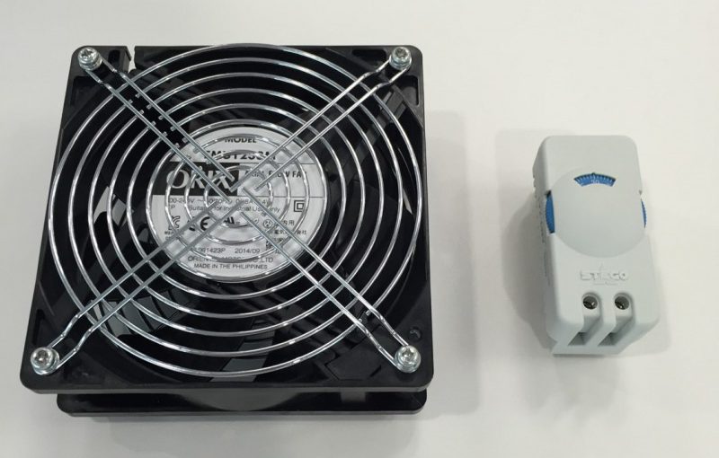 保管庫にファンを取り付けることで保管庫内に空気の流れをつくり、熱を強制的に保管庫の外に排出することができます。