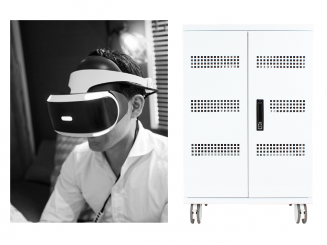 2台に分け、スマホ、HMD、ヘッドホン24セットを充電・保管できます。